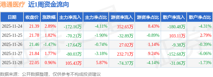 资金流向数据方面,本周港通医疗主力资金合计净流出234.61万元,游资资金合计净流入505.11万元,散户资金合计净流出270.51万元。本周资金流向一览见下表: