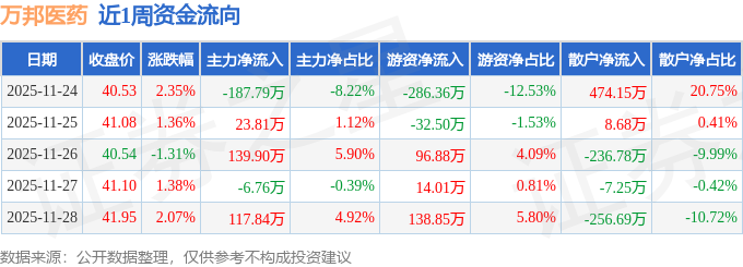 资金流向数据方面,本周万邦医药主力资金合计净流入87.01万元,游资资金合计净流出69.12万元,散户资金合计净流出17.89万元。本周资金流向一览见下表: