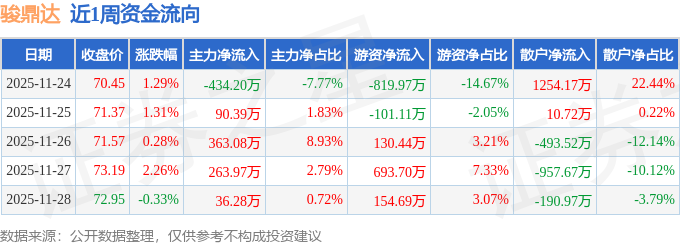 资金流向数据方面,本周骏鼎达主力资金合计净流入319.52万元,游资资金合计净流入57.75万元,散户资金合计净流出377.27万元。本周资金流向一览见下表: