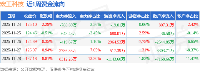 资金流向数据方面,本周宏工科技主力资金合计净流入9247.18万元,游资资金合计净流入2999.31万元,散户资金合计净流出1.22亿元。本周资金流向一览见下表: