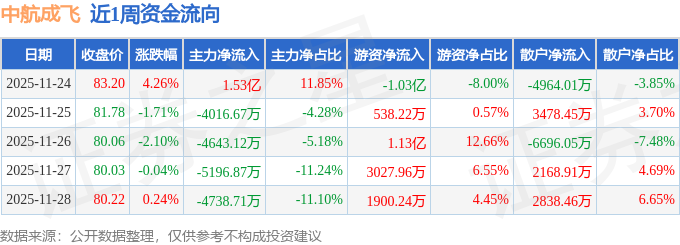 资金流向数据方面,本周中航成飞主力资金合计净流出3311.7万元,游资资金合计净流入6485.95万元,散户资金合计净流出3174.25万元。本周资金流向一览见下表: