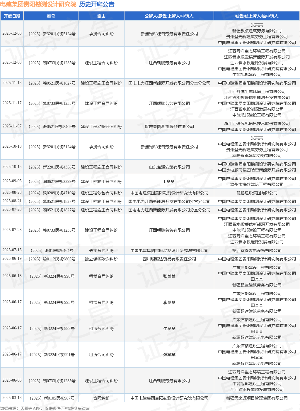 案号:(2025)新3201民初5124号根据统计,近一年内以中国电建集团贵阳勘测设计研究院有限公司为当事人的历史开庭公告有26则,其中案由为“建设工程合同纠纷”的公告以6则居首,其次为“建设工程施工合同纠纷”有6则,“租赁合同纠纷”有4则。历史开庭公告(前20条)如下: