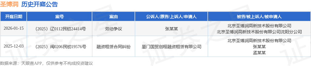 根据统计,近一年内以北京圣博润高新技术股份有限公司为当事人的历史开庭公告有2则,其中案由为“劳动争议”的公告以1则居首,其次为“融资租赁合同纠纷”有1则。历史开庭公告如下:
