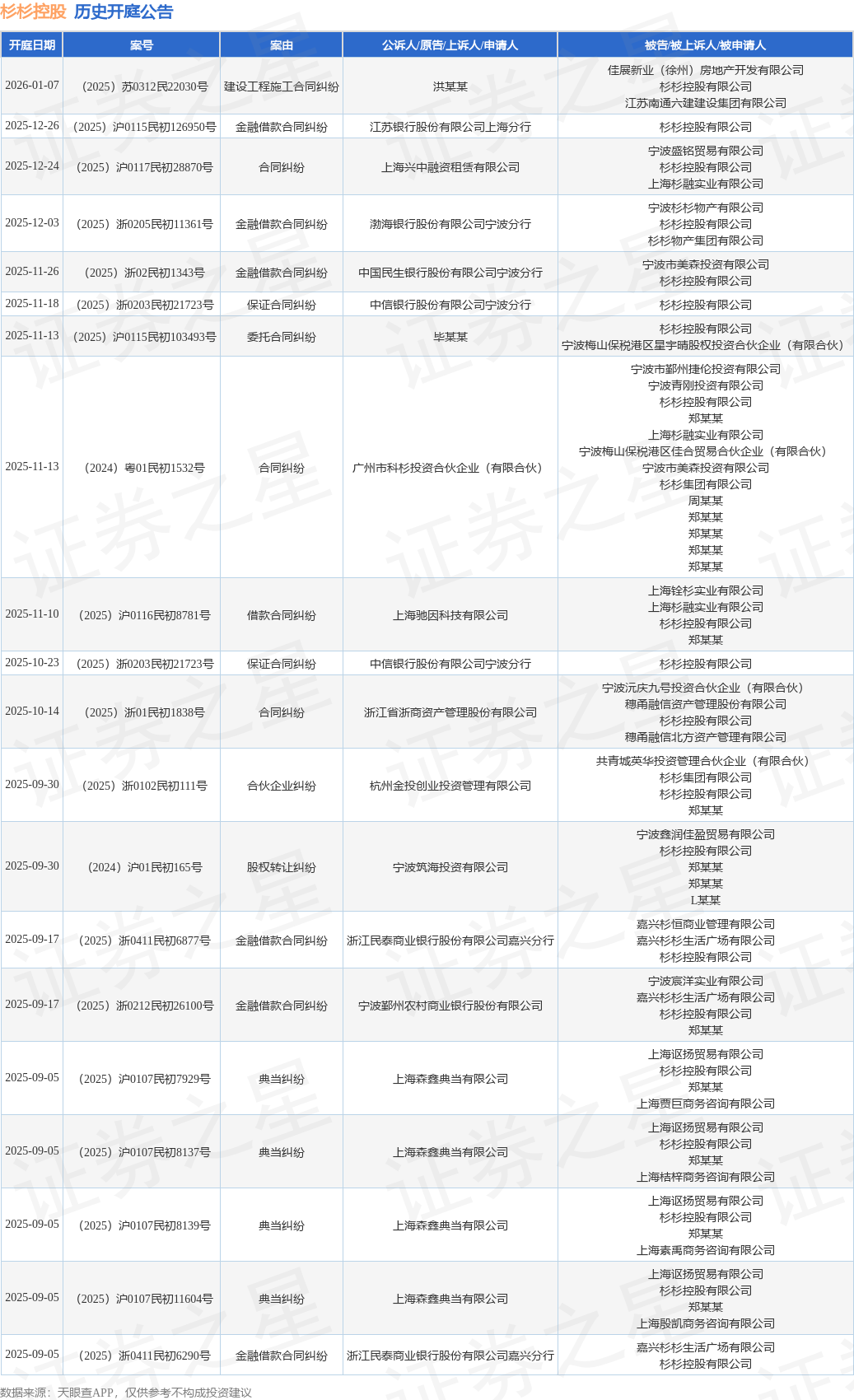 案号:(2025)浙0205民初11361号根据统计,近一年内以杉杉控股有限公司为当事人的历史开庭公告有105则,其中案由为“金融借款合同纠纷”的公告以38则居首,其次为“典当纠纷”有14则,“请求变更公司登记纠纷”有7则。历史开庭公告(前20条)如下: