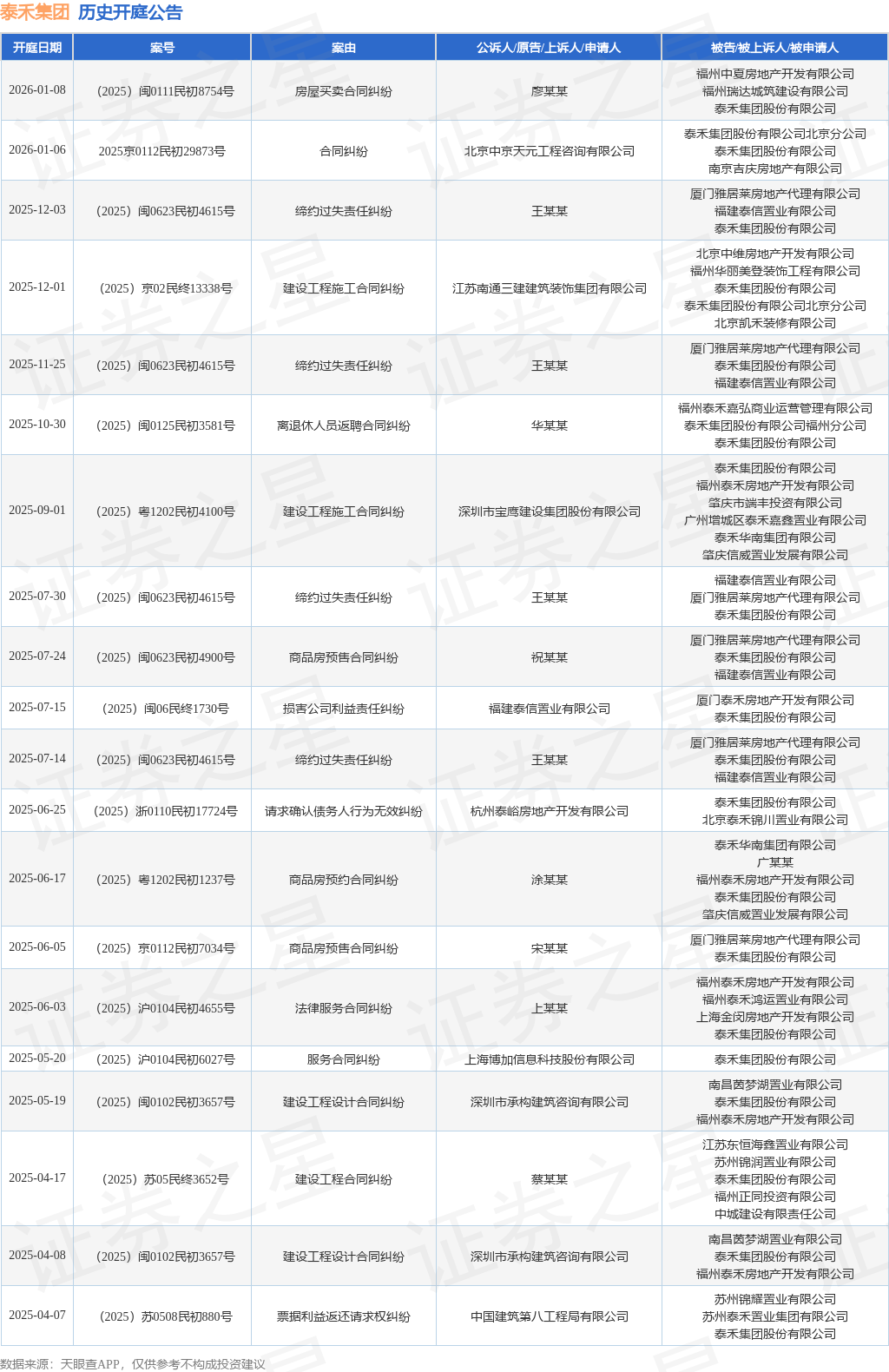 根据统计,近一年内以泰禾集团股份有限公司为当事人的历史开庭公告有32则,其中案由为“缔约过失责任纠纷”的公告以4则居首,其次为“合同纠纷”有3则,“民间借贷纠纷”有3则。历史开庭公告(前20条)如下: