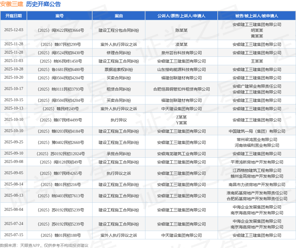 案号:(2025)闽0622民初3664号根据统计,近一年内以安徽建工三建集团有限公司为当事人的历史开庭公告有85则,其中案由为“建设工程施工合同纠纷”的公告以42则居首,其次为“建设工程合同纠纷”有10则,“买卖合同纠纷”有6则。历史开庭公告(前20条)如下: