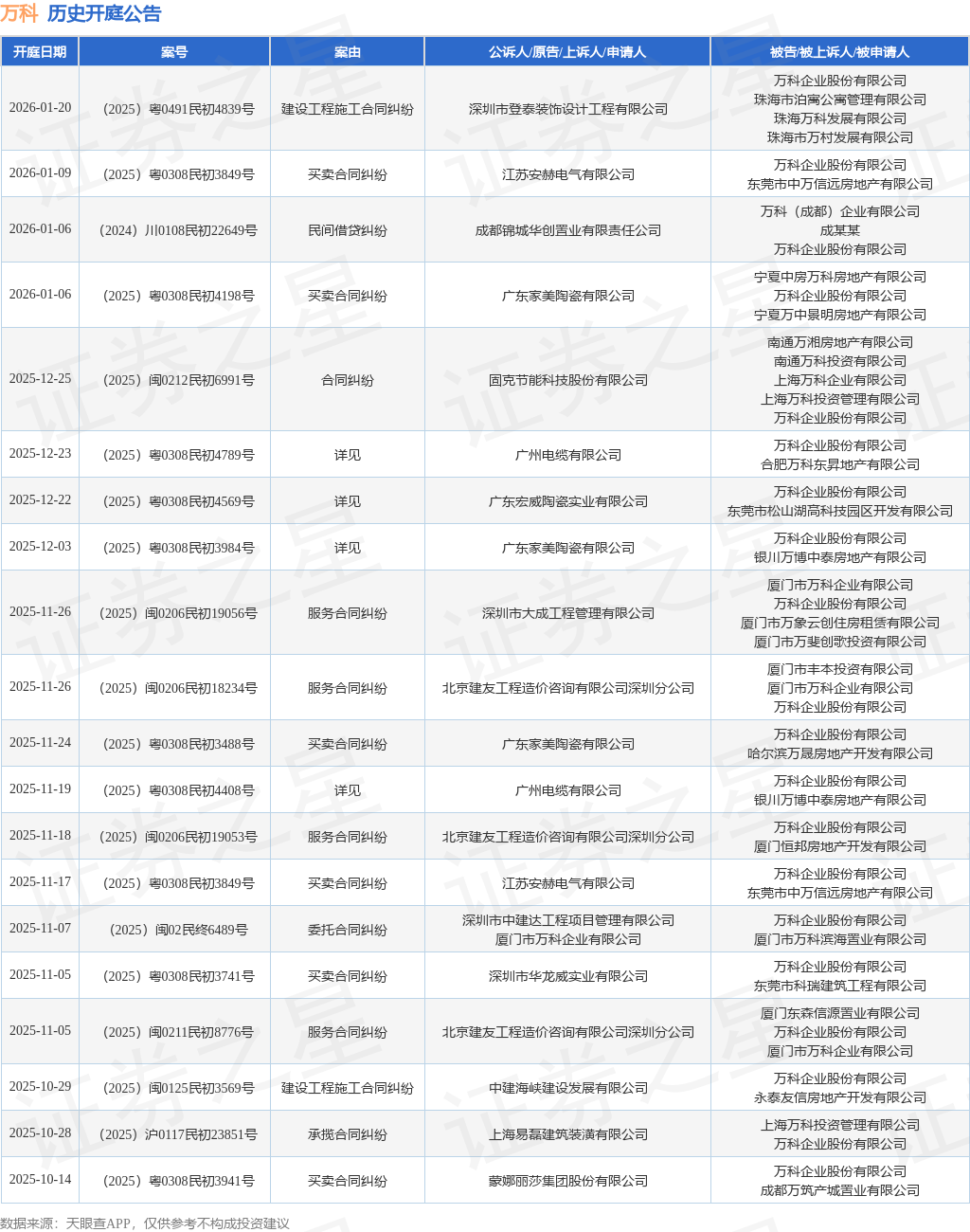 案号:(2025)粤0308民初3984号根据统计,近一年内以万科企业股份有限公司为当事人的历史开庭公告有340则,其中案由为“买卖合同纠纷”的公告以218则居首,其次为“服务合同纠纷”有19则,“建设工程施工合同纠纷”有19则。历史开庭公告(前20条)如下:
