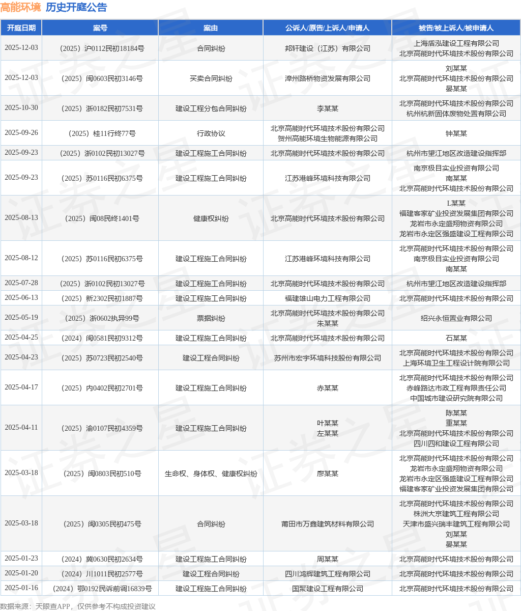 案号:(2025)沪0112民初18184号根据统计,近一年内以北京高能时代环境技术股份有限公司为当事人的历史开庭公告有24则,其中案由为“建设工程施工合同纠纷”的公告以14则居首,其次为“合同纠纷”有2则,“建设工程合同纠纷”有2则。历史开庭公告(前20条)如下: