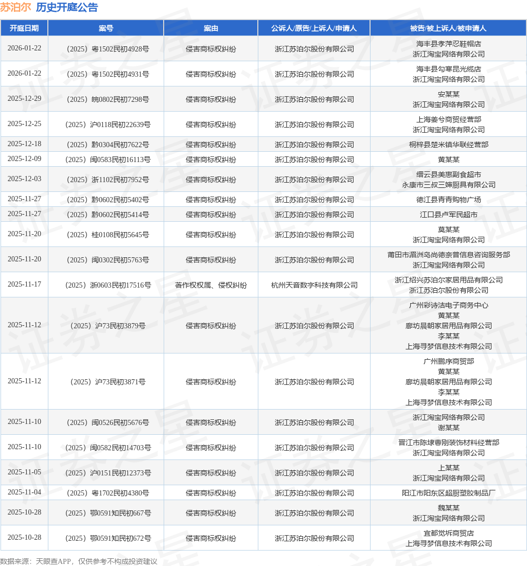 案号:(2025)浙1102民初7952号根据统计,近一年内以浙江苏泊尔股份有限公司为当事人的历史开庭公告有140则,其中案由为“侵害商标权纠纷”的公告以107则居首,其次为“商标权权属、侵权纠纷”有11则,“不正当竞争纠纷”有4则。历史开庭公告(前20条)如下: