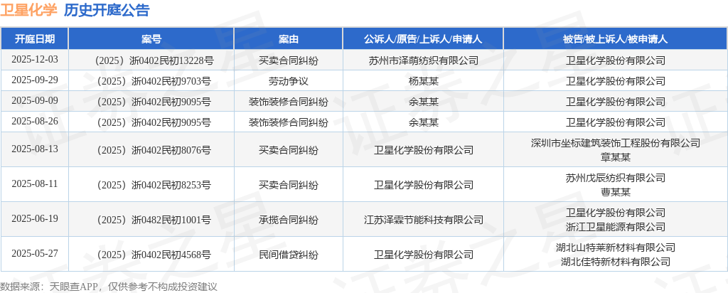 根据统计,近一年内以卫星化学股份有限公司为当事人的历史开庭公告有8则,其中案由为“买卖合同纠纷”的公告以3则居首,其次为“装饰装修合同纠纷”有2则,“劳动争议”有1则。历史开庭公告如下: