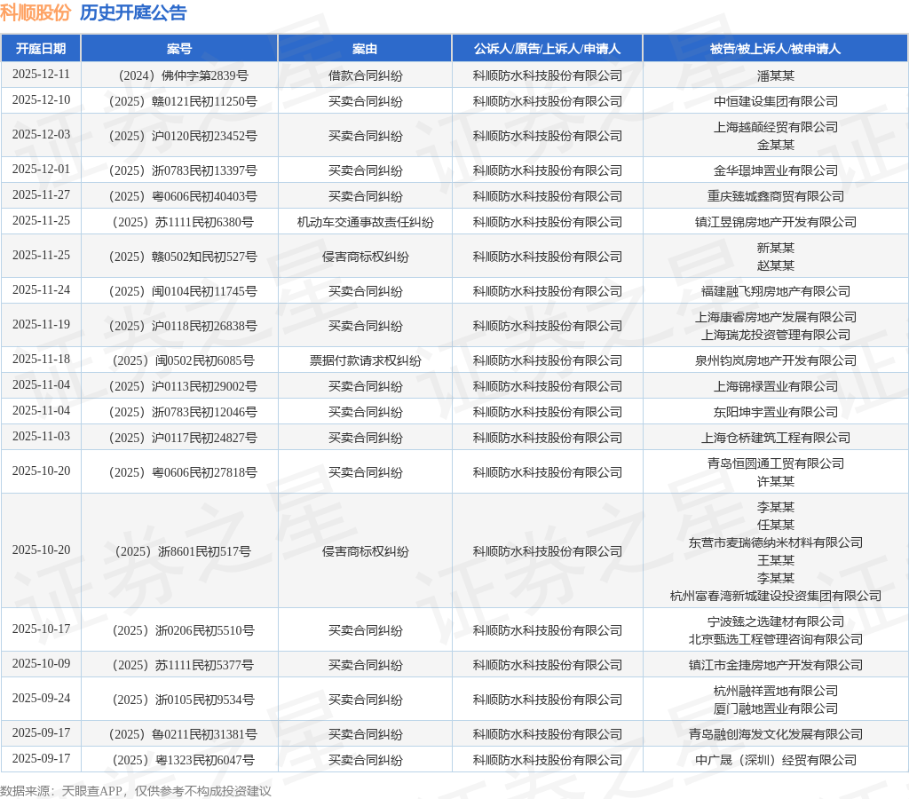 案号:(2025)沪0120民初23452号根据统计,近一年内以科顺防水科技股份有限公司为当事人的历史开庭公告有147则,其中案由为“买卖合同纠纷”的公告以96则居首,其次为“票据纠纷”有15则,“侵害商标权纠纷”有10则。历史开庭公告(前20条)如下: