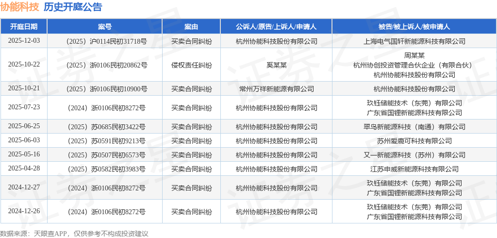 根据统计,近一年内以杭州协能科技股份有限公司为当事人的历史开庭公告有10则,其中案由为“买卖合同纠纷”的公告以9则居首,其次为“侵权责任纠纷”有1则。历史开庭公告如下:
