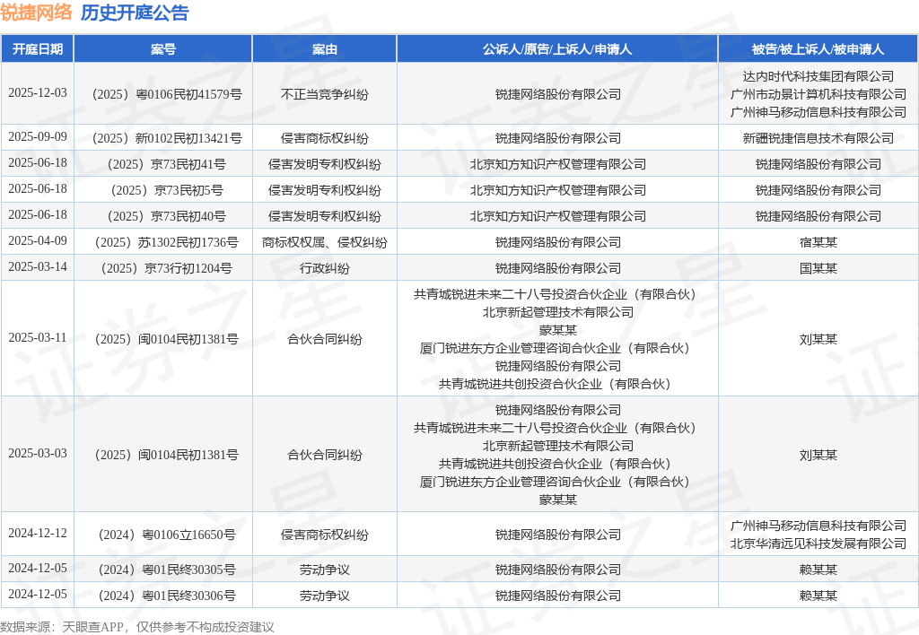 案号:(2025)粤0106民初41579号根据统计,近一年内以锐捷网络股份有限公司为当事人的历史开庭公告有12则,其中案由为“侵害发明专利权纠纷”的公告以3则居首,其次为“侵害商标权纠纷”有2则,“劳动争议”有2则。历史开庭公告如下: