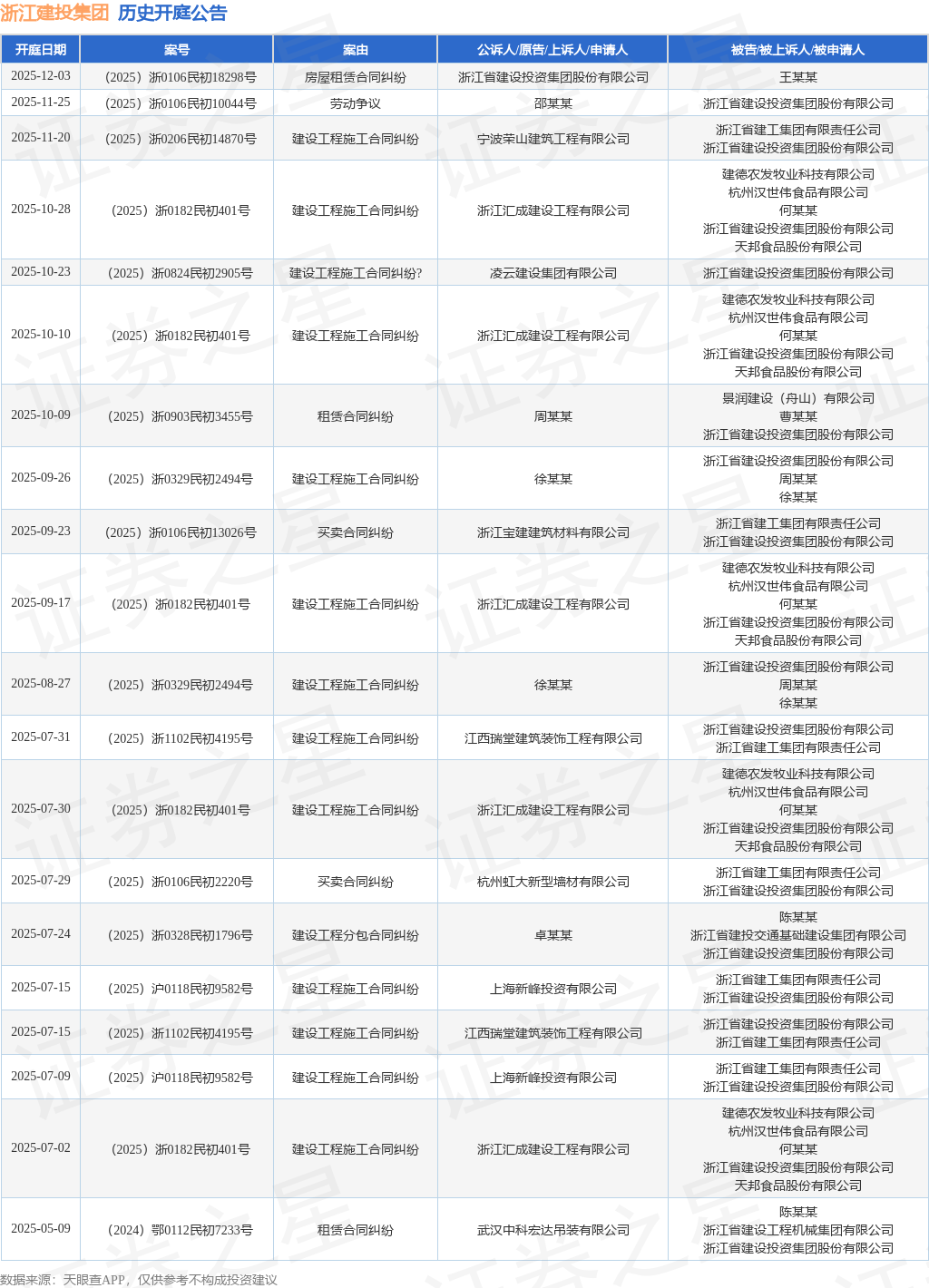 案号:(2025)浙0106民初18298号根据统计,近一年内以浙江省建设投资集团股份有限公司为当事人的历史开庭公告有39则,其中案由为“建设工程施工合同纠纷”的公告以12则居首,其次为“买卖合同纠纷”有9则,“租赁合同纠纷”有5则。历史开庭公告(前20条)如下: