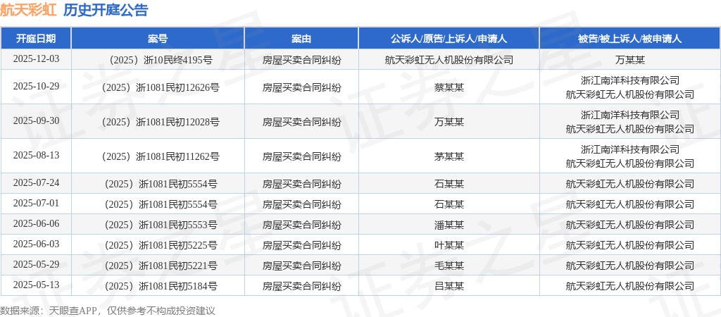 根据统计,近一年内以航天彩虹无人机股份有限公司为当事人的历史开庭公告有10则,其中案由为“房屋买卖合同纠纷”的公告以10则居首。历史开庭公告如下: