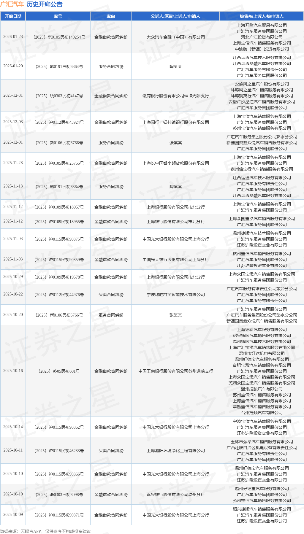 案号:(2025)沪0112民初43924号根据统计,近一年内以广汇汽车服务集团股份公司为当事人的历史开庭公告有109则,其中案由为“金融借款合同纠纷”的公告以38则居首,其次为“买卖合同纠纷”有37则,“服务合同纠纷”有15则。历史开庭公告(前20条)如下: