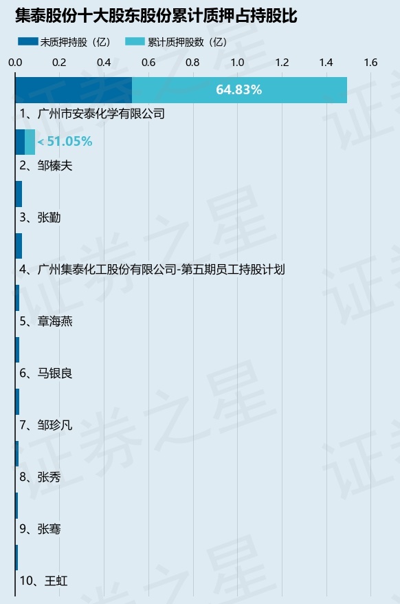 截止本公告日,股东广州市安泰化学有限公司已累计质押股份9680.53万股,占其持股总数的64.83%,股东邹榛夫已累计质押股份460.0万股,占其持股总数的51.05%。本次质押后集泰股份十大股东的累计质押股份占持股比例(占持股比例的计算以公司最新一期财务报表公布的十大股东的持股总数为基准)见下图: