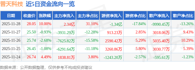 证券之星消息,截至2025年11月28日收盘,普天科技(002544)报收于28.05元,上涨10.0%,涨停,换手率4.03%,成交量27.43万手,成交额7.53亿元。