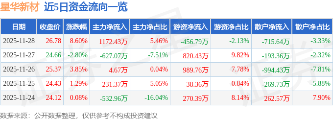 证券之星消息,截至2025年11月28日收盘,星华新材(301077)报收于26.78元,上涨8.6%,换手率8.58%,成交量8.18万手,成交额2.15亿元。