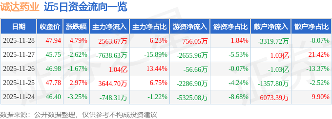 证券之星消息,截至2025年11月28日收盘,诚达药业(301201)报收于47.94元,上涨4.79%,换手率7.96%,成交量8.64万手,成交额4.12亿元。