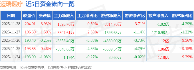 证券之星消息,截至2025年11月28日收盘,迈瑞医疗(300760)报收于204.01元,上涨3.93%,换手率0.97%,成交量11.78万手,成交额23.78亿元。