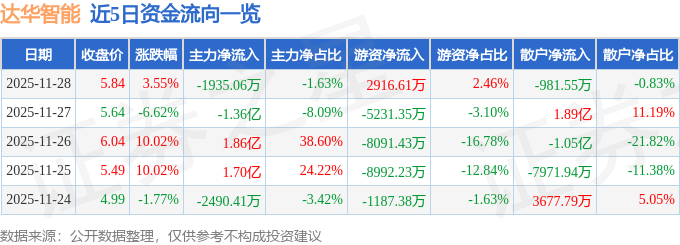 证券之星消息,截至2025年11月28日收盘,达华智能(002512)报收于5.84元,上涨3.55%,换手率18.7%,成交量204.69万手,成交额11.88亿元。
