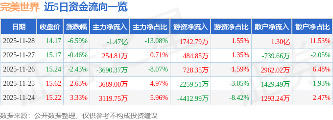 证券之星消息,截至2025年11月28日收盘,完美世界(002624)报收于14.17元,下跌6.59%,换手率4.3%,成交量78.5万手,成交额11.25亿元。