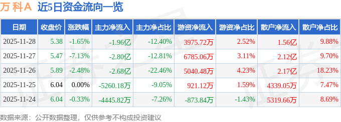 证券之星消息,截至2025年11月28日收盘,万 科A(000002)报收于5.38元,下跌1.65%,换手率3.04%,成交量295.36万手,成交额15.79亿元。