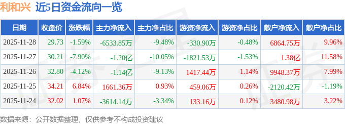 证券之星消息,截至2025年11月28日收盘,利和兴(301013)报收于29.73元,下跌1.59%,换手率12.08%,成交量22.86万手,成交额6.89亿元。