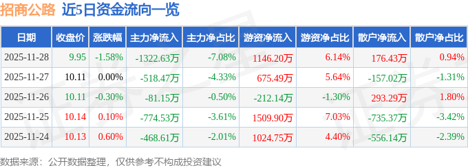 证券之星消息,截至2025年11月28日收盘,招商公路(001965)报收于9.95元,下跌1.58%,换手率0.27%,成交量18.65万手,成交额1.87亿元。