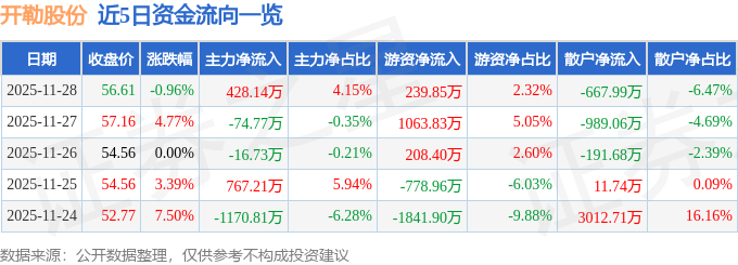 证券之星消息,截至2025年11月28日收盘,开勒股份(301070)报收于56.61元,下跌0.96%,换手率3.1%,成交量1.84万手,成交额1.03亿元。