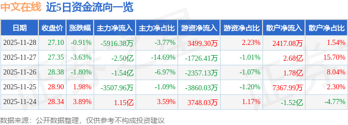 证券之星消息,截至2025年11月28日收盘,中文在线(300364)报收于27.1元,下跌0.91%,换手率8.65%,成交量57.1万手,成交额15.71亿元。