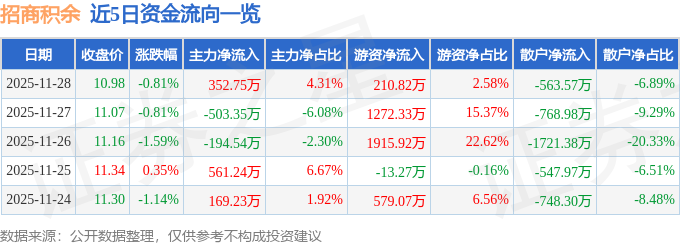 证券之星消息,截至2025年11月28日收盘,招商积余(001914)报收于10.98元,下跌0.81%,换手率0.7%,成交量7.47万手,成交额8177.92万元。