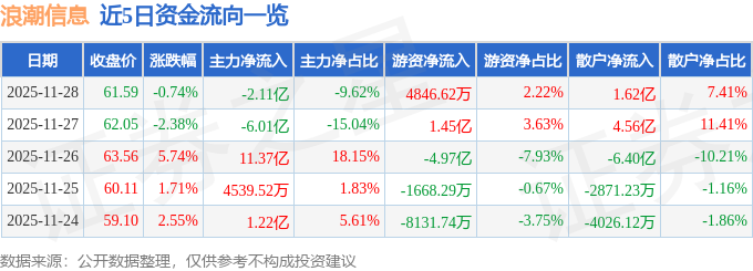 证券之星消息,截至2025年11月28日收盘,浪潮信息(000977)报收于61.59元,下跌0.74%,换手率2.43%,成交量35.66万手,成交额21.88亿元。