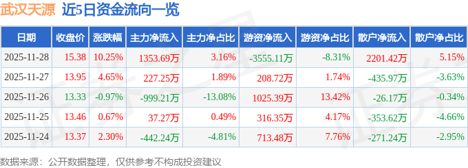 证券之星消息,截至2025年11月28日收盘,武汉天源(301127)报收于15.38元,上涨10.25%,换手率4.29%,成交量28.51万手,成交额4.28亿元。
