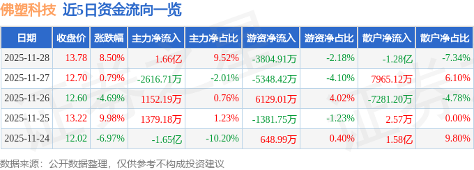 证券之星消息,截至2025年11月28日收盘,佛塑科技(000973)报收于13.78元,上涨8.5%,换手率13.41%,成交量129.77万手,成交额17.47亿元。