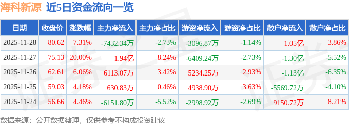 证券之星消息,截至2025年11月28日收盘,海科新源(301292)报收于80.62元,上涨7.31%,换手率39.34%,成交量33.47万手,成交额27.25亿元。