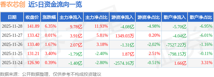 证券之星消息,截至2025年11月28日收盘,香农芯创(300475)报收于141.89元,上涨6.35%,换手率13.33%,成交量59.37万手,成交额81.96亿元。