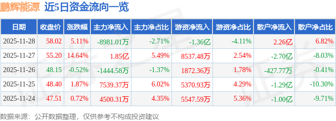 证券之星消息,截至2025年11月28日收盘,鹏辉能源(300438)报收于58.02元,上涨5.11%,换手率14.15%,成交量57.19万手,成交额33.17亿元。