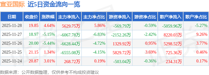 证券之星消息,截至2025年11月28日收盘,宣亚国际(300612)报收于19.85元,上涨4.64%,换手率26.92%,成交量48.42万手,成交额9.61亿元。