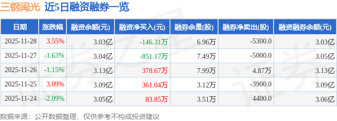 三钢闽光融资融券信息显示,融资方面,当日融资买入950.33万元,融资偿还1096.64万元,融资净偿还146.31万元。融券方面,融券卖出0.0股,融券偿还5300.0股,融券余量6.96万股,融券余额30.42万元。融资融券余额3.03亿元。