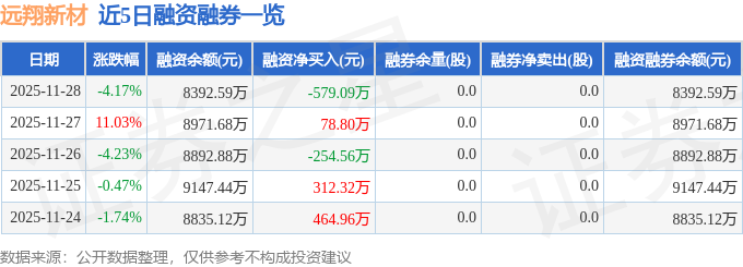 证券之星消息,截至2025年11月28日收盘,远翔新材(301300)报收于45.24元,下跌4.17%,换手率15.58%,成交量4.82万手,成交额2.2亿元。
