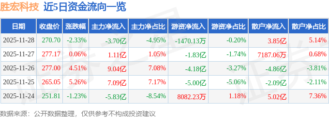 证券之星消息,截至2025年11月28日收盘,胜宏科技(300476)报收于270.7元,下跌2.33%,换手率3.23%,成交量27.58万手,成交额74.74亿元。