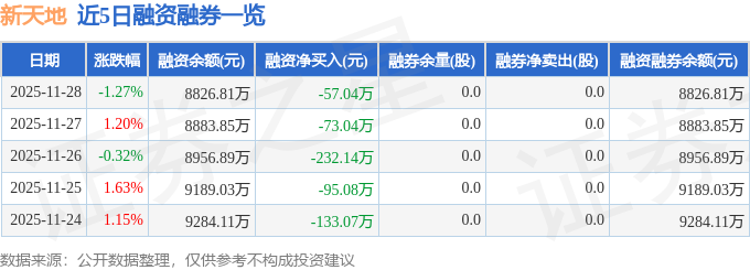 新天地融资融券信息显示,融资方面,当日融资买入306.7万元,融资偿还363.74万元,融资净偿还57.04万元。融券方面,融券卖出0.0股,融券偿还0.0股,融券余量0.0股,融券余额0.0万元。融资融券余额8826.81万元。