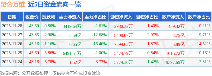 证券之星消息,截至2025年11月28日收盘,昆仑万维(300418)报收于43.5元,下跌0.8%,换手率3.87%,成交量48.59万手,成交额21.22亿元。