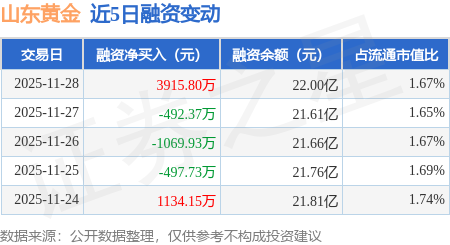 证券之星消息,11月28日,山东黄金(600547)融资买入1.29亿元,融资偿还8986.47万元,融资净买入3915.8万元,融资余额22.0亿元。