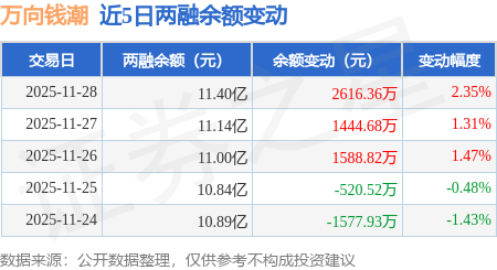 证券之星消息,11月28日,万向钱潮(000559)融资买入1.86亿元,融资偿还1.59亿元,融资净买入2644.56万元,融资余额11.25亿元,近3个交易日已连续净买入累计5589.04万元。