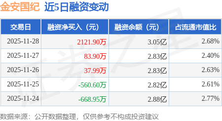 证券之星消息,11月28日,金安国纪(002636)融资买入7782.86万元,融资偿还5660.96万元,融资净买入2121.9万元,融资余额3.05亿元,近3个交易日已连续净买入累计2243.79万元。