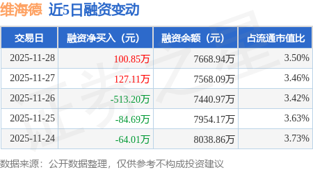 证券之星消息,11月28日,维海德(301318)融资买入217.36万元,融资偿还116.51万元,融资净买入100.85万元,融资余额7668.94万元。