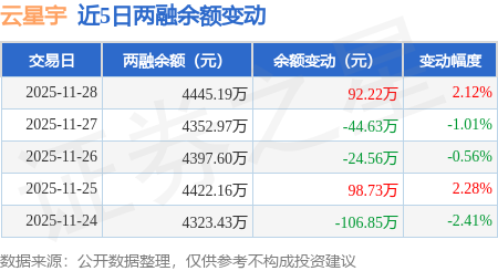 证券之星消息,11月28日,云星宇(920806)融资买入189.53万元,融资偿还97.31万元,融资净买入92.22万元,融资余额4445.19万元。